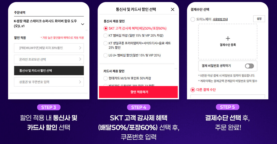 - 배달 주문: 도미노피자 50% 할인 (최대 25,000원)